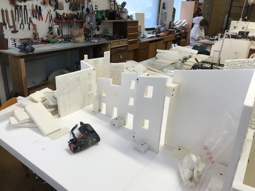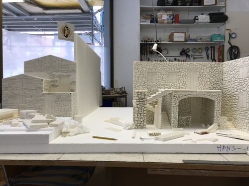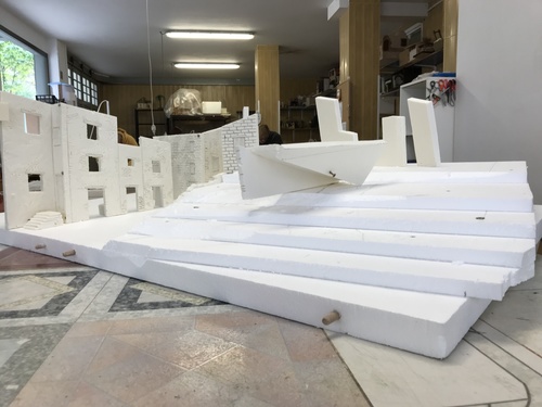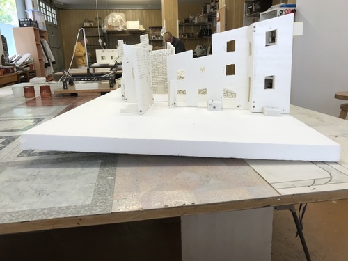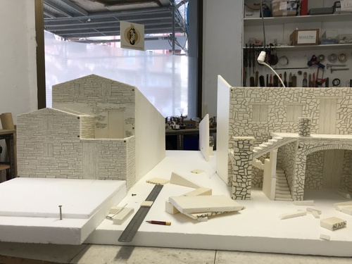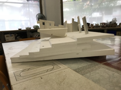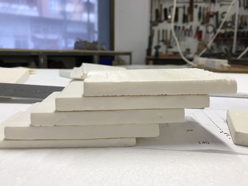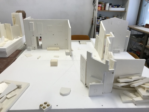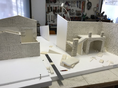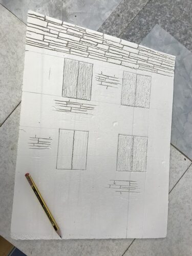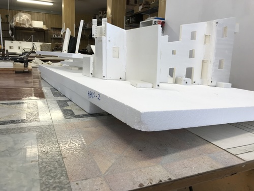 Colocamos unas láminas de poliespán escalonadas para posteriormente ir tallándolas para hacer un montículo sobre el que irán unas casas.