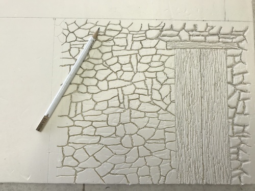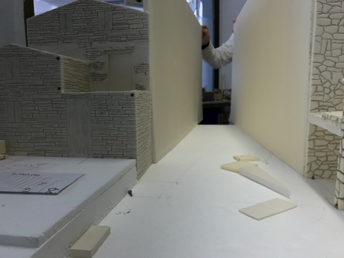 Debido a un taco de 4 cm que se ha colocado por debajo al final de la parte posterior del diorama, el suelo queda inclinado hacia arriba en su parte posterior. Si se hace esto habrá de tenerse en cuenta que el suelo de las casas tendrán una inclinación contraria para que se mantengan derechas y no inclinadas.